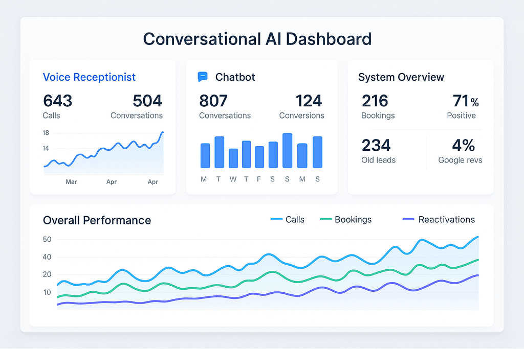See exactly what’s happening across your enquiry flow — calls answered, bookings made, missed-call recovery, reactivations, and more. Simple, clear metrics that matter.